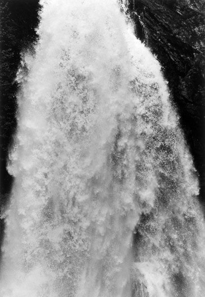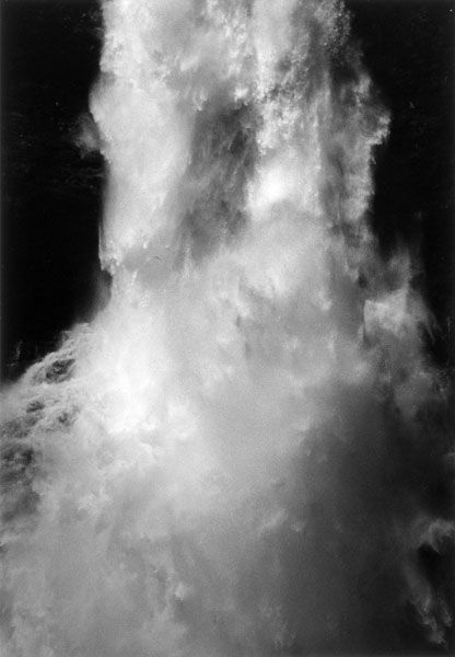 その時に気付いたのですが、水しぶきというのは大気に押し戻されて、白く見えているのだということを知りました。ですので、表面の動きは完全に上に向かっています。そのことも手伝ってか、いざカメラを向けてみると、それはまるで光の化身のように、ぼくの目には映りました。しかも、ふつうであれば視覚認識することが出来ない“光そのもの”のすがたがそこにあるようで、とても神々しく感じました。そして、それは、動きで言えば圧倒的な“動の世界”です。音だって、「ゴー」とものすごい大きな音が聞こえています。しかし、印象としてはけっしてうるさくはありません。そして、それらの水は雪解け水なのですから、ものすごく冷たい水なのです。それでも、そこに写し出されている光景は、けっして冷たいものではありませんでした。ぼくにはなんとなく、そのことがすごくうれしくて、しかも、あの奈良の静寂の光景の源が、このような美しい世界でもあったことがうれしかったのでした。ぼくは、その光の化身のようにも見えた水しぶきを、カメラをずぶぬれにしながら、必死で撮影を繰り返しました。