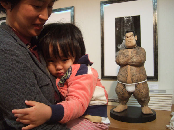 ブログ連載が大好評の写真研究家・小林美香さんがお嬢さんを連れて来廊。ちょっと後の木彫が恐かったかしら。