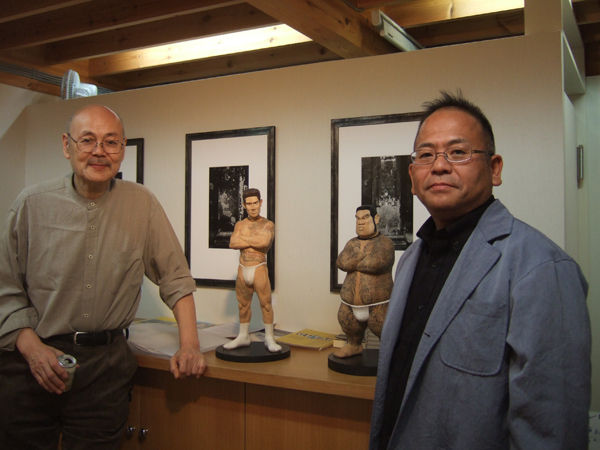 来年の個展の打合せに名古屋から上京された彫刻家の葉栗剛さん(右)。後の作品は葉栗さんの「男気」シリーズ、木彫に刺青が描かれています。