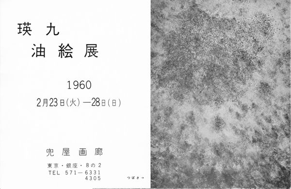 めずらしく油絵の近作をまとめた瑛九の個展(兜屋画廊 2・23-28)を見て、私はふしぎな感じを抱いたものである。「ある日天井を眺めていると、フト描けないから個展でもやってみたら……という考えがうかび」展覧会をひらいたと、カタログの片隅に小さく書かれてある。昨年十一月から慢性じん炎で病臥中だという。親友の小野里利信氏がひとり会場にいた。病状は一時危なかったが、東京の病院に移ってからは愁眉をひらいたという。しかし私はこの会場にいて、作者と作品とのあいだで、なにか取り残されたような感じをどうすることもできなかった。病臥中の作者が、作品をひとりで出してやり、自分は横臥しているという気持はよくわかるようで、同時に奇異な感じがする。だが、それも瑛九らしい、とその場をつくろう気持がなかったとはいえない。そしてそれが誤解の一因なので