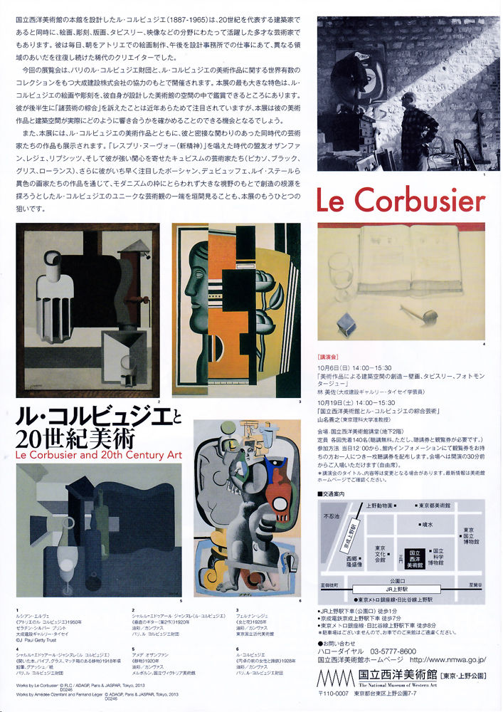 また、本展には、ル・コルビュジエの美術作品とともに、彼と密接な関わりのあった同時代の芸術家たちの作品も展示されます。彼が「レスプリ・ヌーヴォー(新精神)」を唱えた時代の盟友であったオザンファン、レジェ、リプシッツ、そして彼が強い関心を寄せたキュビスムの芸術家たち(ピカソ、ブラック、グリス、ローランス)、さらに彼がいち早く注目したボーシャン、デュビュッフェ、ルイ・ステールら異色の画家たちの作品を通じて、モダニズムの枠にとらわれず大きな視野のもとで創造の根源を探ろうとしたル・コルビュジエのユニークな芸術観の一端を垣間見ることも、本展のもうひとつの狙いです。(同館HPより引用)