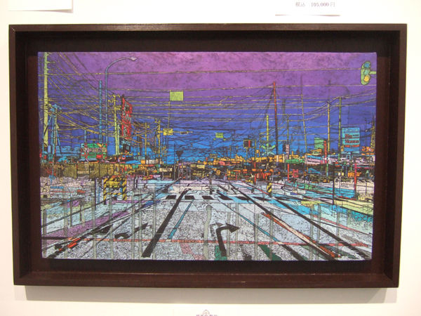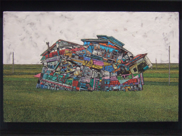 デジカメで撮影した風景をPC上でコラージュし、下書きとしてパネルに印刷した上から油彩を塗った作品。デジタル出力の下書きならではの細かさに油彩の手書きが加わり、独特な質感を生んでいます。