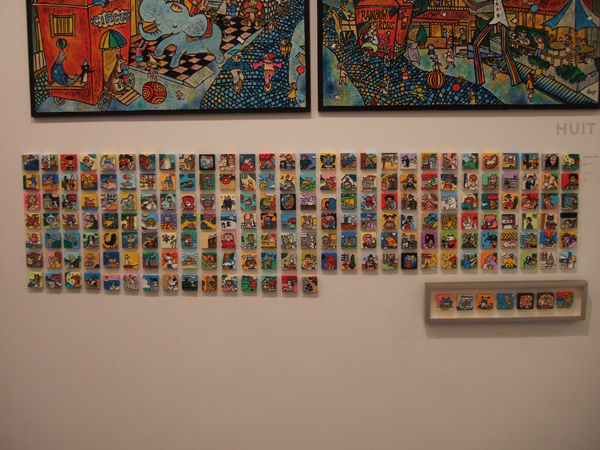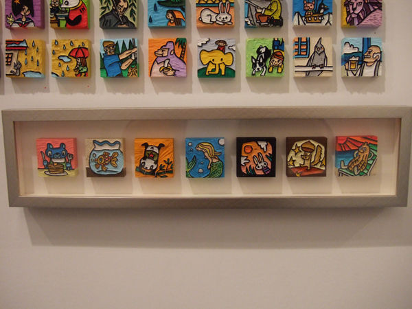 壁にビッシリと張り詰められた、手彩色の木彫り作品からお好みで7点を選び、下の写真のように纏めた状態で一つの作品となる模様。