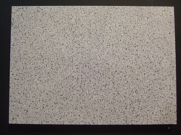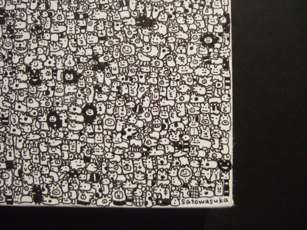 佐藤明日香パイロットの0.25mmボールペンでミリサイズのゆるキャラをひたすら描いて、描いて、描いて…A3サイズの紙を埋め尽くすとこんな感じになります。遠めに見ると不規則な模様にしか見えませんが、寄って見るといるわいるわ。黒ベタ部分もボールペンで塗っているそうで、紙一枚にペン一本と書くとお手軽に聞こえますが、実際そこに込められた手間は計り知れません。