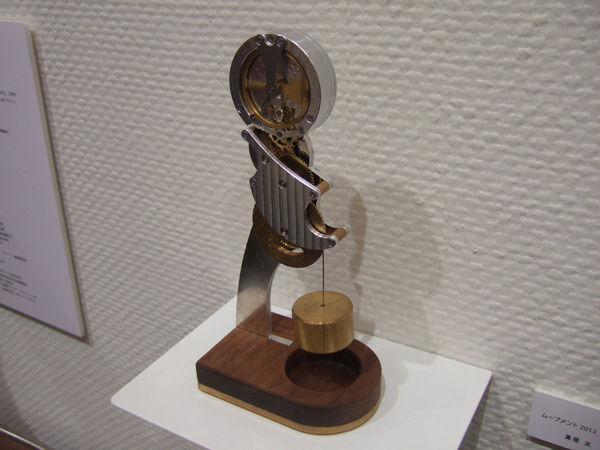 錘を持ち上げて手を離すと、連動した歯車が動作して錘がゆっくりと下降していくギミック作品です。