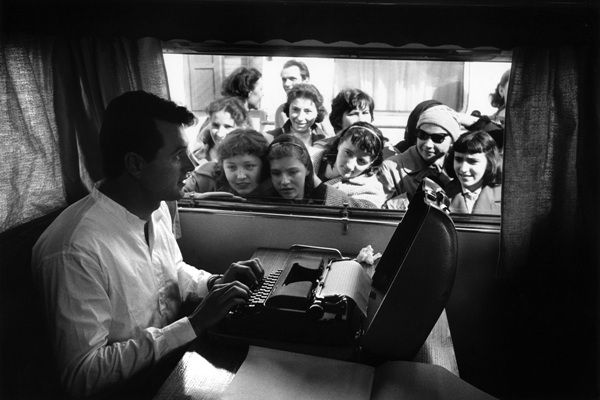 北イタリアのグラドは『武器よさらば』のロケ地。ロック・ハドスンは、移動式ドレッシング・ルームのカーテンを開き、明かりを入れて、タイプを打っている。窓の外からは、あらゆる年齢層のイタリア女性がハリウッドスターをひと目見ようと覗きこんでいる。私はルック誌の仕事でロックを取材にきたのだが、どこに行ってもすぐに人だかりができた。1957年