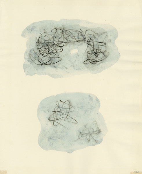 (註。火で焦がす、ローソクの煙で燻らす、火と水の交互作用の試み、モーターによる回転描線、デカルコマニー、等々がそれにつづく。その実例はここでは省略)。