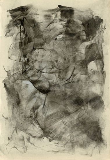 ⑤ こうして得られた作品は、伝統的な(構想・配列・措辞に基づく)制作や作品の概念を逸脱した、行為の余剰ないし証拠品と位置付けられているようである。といっても作品を作る意図や志向が無いわけではなく、展覧会の開催、サインや年代の記載などの事実がそれを証拠付けている。60年9月の最初の個展(南天子画廊)の自序の冒頭一節「プエブロ・インディアンたちは砂の上に絵を描きます」は(同4巻75頁)、西洋絵画の伝統に根差さない制作への志向を示唆するものかもしれない。実際、1970年頃に制作された黒色のデカルコマニーは、東洋の水墨画を想起させるところがある。