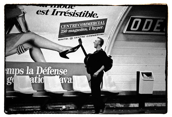 パリはどこを撮っても、風景も人も美しい“絵”になる街で、それを象徴するのがロベール・ドワノー(Robert Doisneau 1912-1994)の写真「パリ市庁舎前のキス」だろう。この作品は、日本でも東京都写真美術館の外壁を飾る写真壁画になっているほど有名なのだが、残念ながら、のちにドワノー自身の告白で演出だったことがわかり、失望した人も多いはずだ。それもあってか、ここに紹介する百瀬の作品を見て、「モデルさん使ったの?」とよく聞かれるそうだが、まったくそうではなく、演出はゼロ。ただし、ここが案外ポイントかもしれないのは、どの写真も「これだ!」と思うシャッターチャンスは1回のみというところだ。「シャッターがぶれると困るので、写真を撮る姿勢には持っていっている」にしても、まさに瞬間芸? たとえば、「向こう側のホームでワーッと叫んでいる人がいたのでシャッターを押したら、その音に気づいた彼がこっちを見て親指を立ててOK! の合図をしてくれた」という地下鉄オデオン駅の写真も、シャッターを押したのは1回のみ。それなのに、この写真でギターの先端が突き刺している広告の文字「Irrésistible」は「抗し難い」という意味で、フランス語を知っている人なら、あまりの出来すぎに「やらせ?」と思ってもおかしくない。けれどもこれに関しては、フランス語は「ファティゲfatigué(e)」(疲れた)や「ジェ・ファン J’ai faim」(お腹が空いた)ぐらいは使える百瀬も、この単語は未知のものだったらしく、あとで知って「えっ!」。また、気配を消す百瀬の不思議さがわかるのが、学生街サン=ミシェルで抱き合う男女の写真。「気づいたら、カメラが勝手に動いて撮っていた」シーンも、シャッターを押したのは1回のみ!