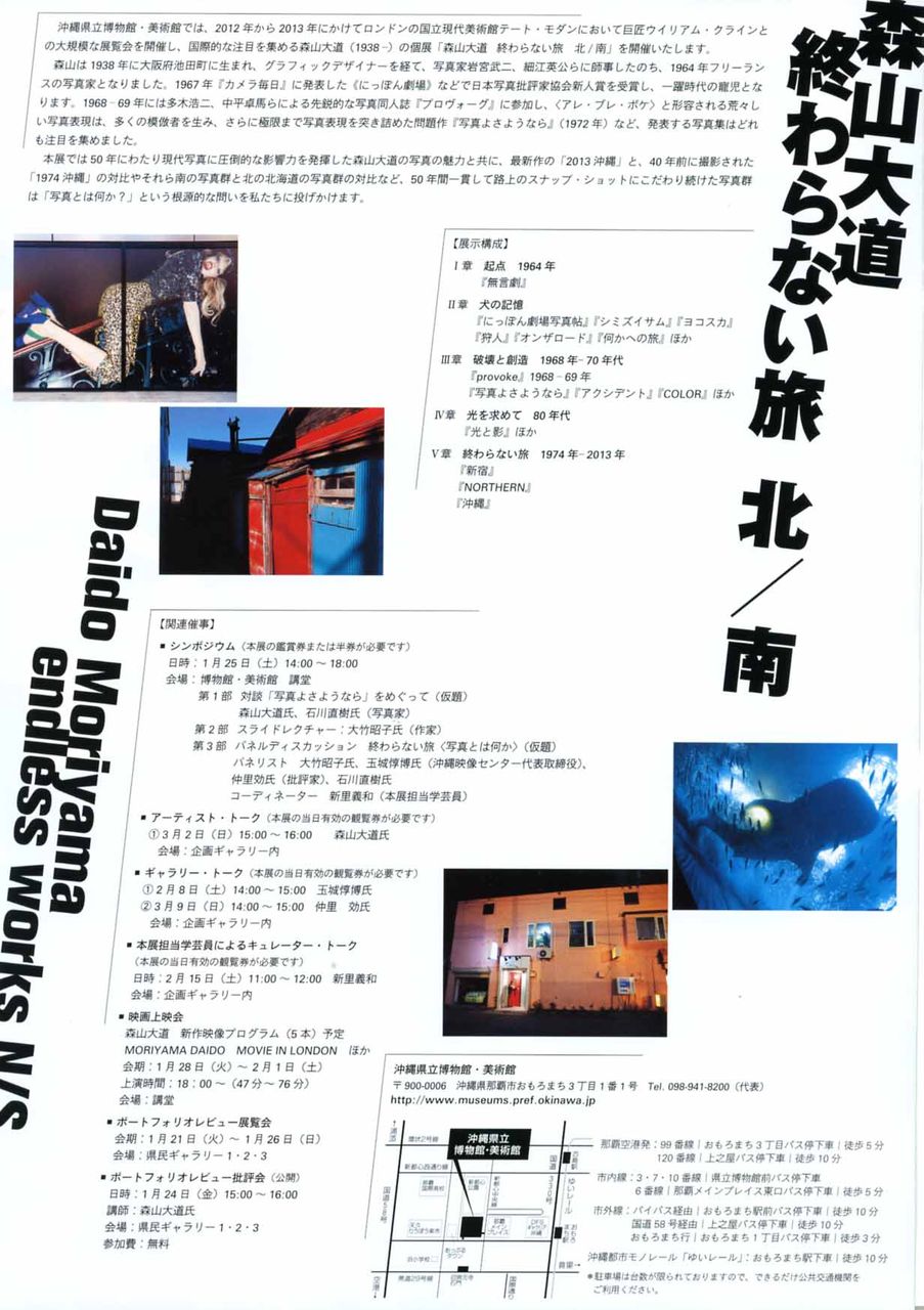 本展では50年にわたり現代写真に圧倒的な影響力を発揮した森山大道の写真の魅力と共に、最新作の「2013沖縄」と、40年前に撮影された「1974沖縄」の対比やそれら南の写真群と北の北海道の写真群の対比など、50年間一貫して路上のスナップ・ショットにこだわり続けた写真群は「写真とは何か?」という根源的な問いを私たちに投げかけます。(同館HPより転載)