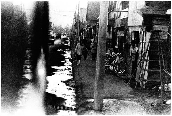 大通りには雪が凍てついたまま残っている。歩道に目をやると、こちらにむかって歩いてくる手さげ袋をもち足元はゴム長靴の女。すぐ後ろに、耳あて帽子をかぶった母親と幼児の二人連れ。いちばん手前の家では玄関のガラス戸を半開きにし、やはり親子とおもわれる女と少年が通りをながめている。少年はトックリのセーターにカーディガン姿。軒先には自転車がならべられ、古風な木製の脚立がたてかけてある。