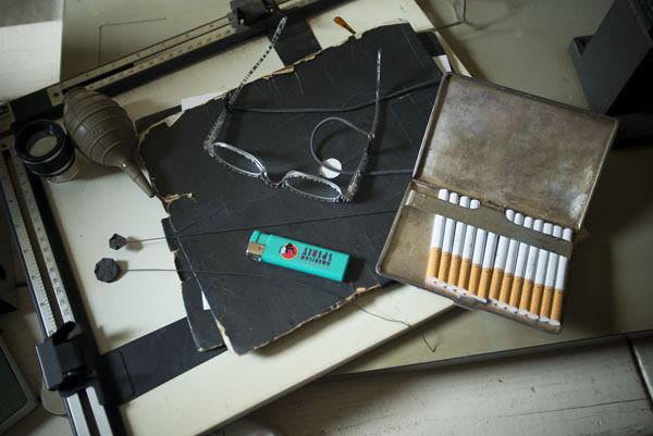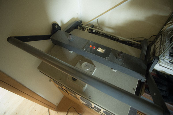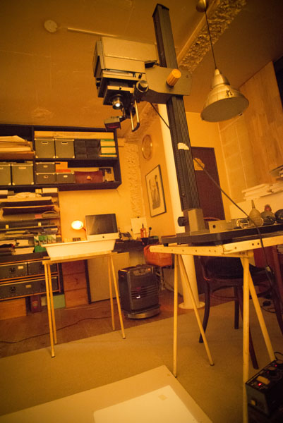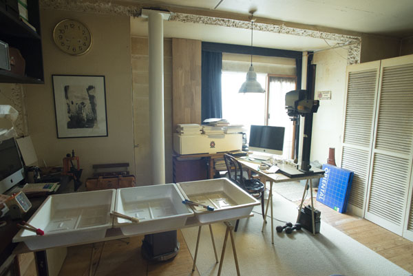 暗室になるのは19平方メートルぐらいの仕事場で、普段はデスクの上のパソコンや大型のプリンターが主役の顔をしている。仕事場の片隅には引き伸ばし機と、全紙サイズの紙焼きまで乾燥させられる結構大きな乾燥機もある。彩光部は外に面してすりガラスになった一面と、居住空間へのドア部分で、この二カ所にカーテン状になった暗幕(常設)を張り巡らすと暗室に変身する。普通サイズの紙焼きはこのままでいいのだが、今回は全紙サイズを作るので、引き伸ばし機をデスクの上に移動し、印画紙を床の上に置いて投影する作業をした。