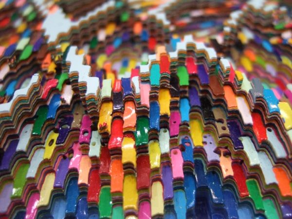 立体のように見える平面作品…ではなく、色の層を幾つも幾つも重ねて立体を構築しているという我慢と根気の結晶のような作品です。表面のあちこちに気泡の発生によってできた無数の穴があるのですが、これがまた人の手では再現できないスケールの構造を作り出しており、じっくりと眺めていても不思議と飽きない一品です。