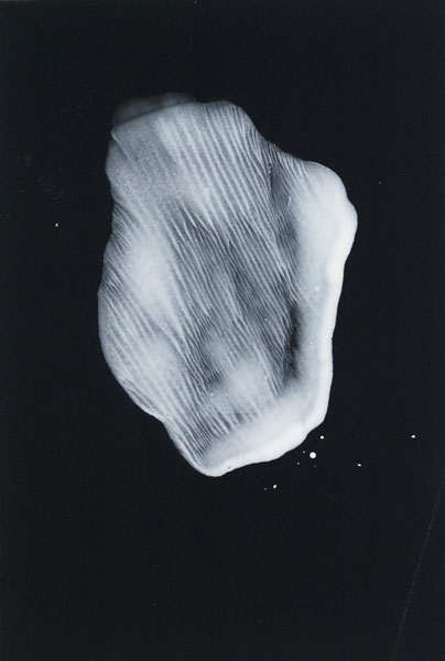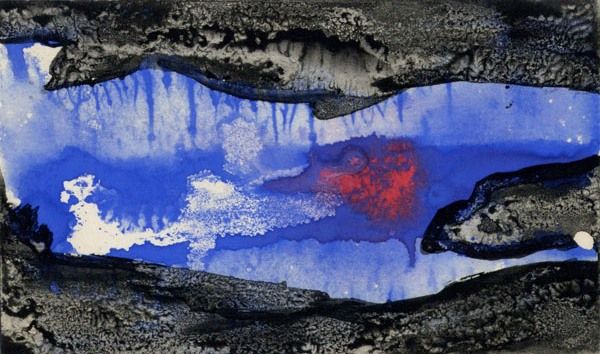 デカルコマニーと言えばやはりマックス・エルンストの作品だろう、と思う。そして両者の作品を思い浮かべるとき、僕は、瀧口のそれは今は世界的評価は未知数かも知れないが、やはりエルンストの対岸にあるべき作品、と思う。エルンストのそれは、完全に “ 謎 ” としての存在である。そして瀧口のそれは、形態も色彩も変化して止まない微生物の “ 変容 ” の世界である、と思う。言ってみれば瀧口のデカルコマニーはミクロコスモスの蠢 ( うごめ ) きである。じっと見つめていると、様々な生体が見えてくるのである。時には、色彩自らが拡散・収縮する様は、何かの発生に立ち会うようで実にダイナミックである。こんな小さな紙の上で … 、さえも。>