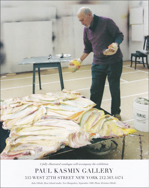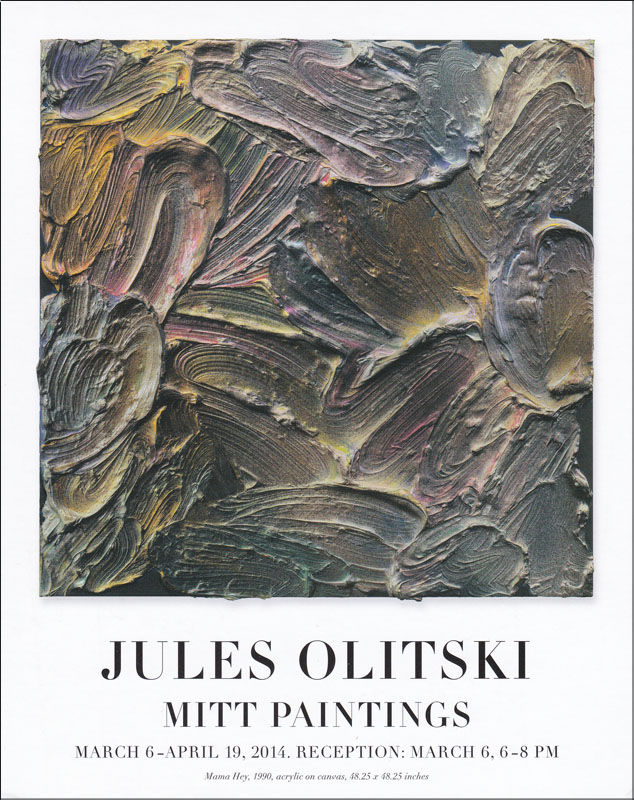 具体の白髪一雄が、現在、欧米で支持され、とてつもない価格で市場の評価を得ている。それへの連想からか、チェルシー地区にある一流画廊、ポール・カズミン画廊で、今迄放置されていたジュールズ・オリツキー(注2)の展覧会(資料4)〔2014年3月6日~4月19日〕が開かれている。ボクシングのグローブのような手袋をはめた手で、キャンバスの上に絵具をぬりたくる。白髪ほど、画面に繊細さ、切れ味はないが、描かれたフォルムはいささか似ている。