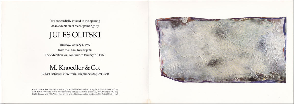 1987年頃、当時の超一流画廊、ニューヨークのマンハッタンにあったヌードラー〔1846年設立。当時で141年の歴史をもつ〕で、この作家の作品と初めて出会った。その時の第一印象は「白髪と似ているな」。銀色がかったメタリックの塗料で、白髪のようなフォルムが描かれていた。作品の雰囲気は、白髪の湿度の多さを感じさせるホットな作品に対して、オリツキーのは乾燥したクールさを感じた。