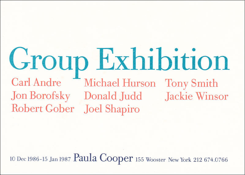 ソーホー地区の155 Wooster Streetにあった頃のポーラ・クーパー画廊で、DEC. 10, '86~JAN. 15, '87の間、開かれたグループ展の案内状。当時、2番手グループの作家を入れても、このような展覧会ができたのだ。