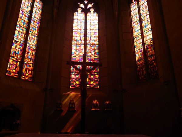 Saint-come-d’oltの町の中心には大きな教会があった。そこで一休み。天井まで届きそうな大きなステンドグラスはカラフルなモザイク模様が施してある。そのステンドグラスを通した光が空間を赤く染める。