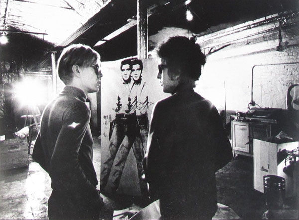 シルヴァー・ファクトリーでのアンディ・ウォーホルとボブ・ディラン(ゼラチン・シルヴァー・プリント1965)撮影:ナット・フィンケルスタイン(筆者蔵)