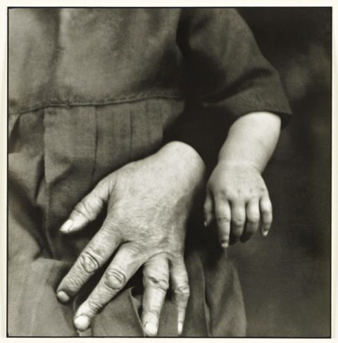 大戦間期のドイツで、さまざまな人たちのポートレート写真を撮影し、『20世紀の人々』という記念碑的な作品を制作したアウグスト・ザンダー(August Sander, 1876-1964)は、ポートレート写真の一部をトリミングして、被写体の手に焦点を合わせた習作を残しています。「習作(お祖母さんと子ども)」(図5)は、幼い子どもがお祖母さんの膝の上に抱きかかえられた状態で撮影されたポートレート写真の一部をトリミングしたものです。しっかりと力を入れて子どもの身体を支えているお祖母さんの手と、お祖母さんの腕の中に身を委ねている幼い子どもの腕と手の所作、それぞれの手の大きさや皮膚のディテールが、画面の中にコントラストを生み出しています。一連の習作は、ザンダーがポートレート写真を撮影する際に、手の仕草が画面全体の中にもたらす効果に注目し、研究を重ねていたことを伺わせます。