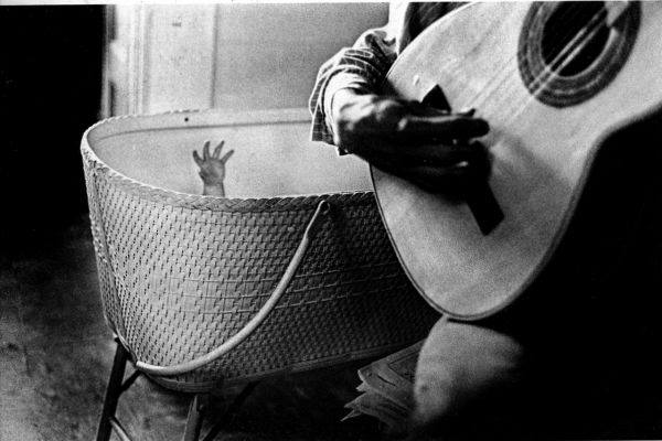 人物を撮影する写真家にとって、手の所作やジェスチャーは尽きせぬ関心の対象として、表現の中で重要な位置を占めています。アメリカの写真家ラルフ・ギブソン(Ralph Gibson, 1938-)は活動の初期から、人の身体、偶発的な手の仕草や身振りを間近に捉えた写真を数多く撮影し、独特なニュアンスを湛えた写真でシークエンスを構成し、『Deja Vu』(1972) などの写真集を発表しています。初期作品の中でも良く知られる「赤ん坊の手とギター」(1960-61年)(図6)は、ギターをかまえて弦に指をかけようとする男性の手と、揺り籠の中から手を伸ばし、指を広げてその音に反応するような赤ん坊の仕草が捉えられており、言葉によらない、赤ん坊と男性の間のやり取りの一瞬がとらえられています。ギターの描くカーブと揺り籠の丸い形が手の仕草と呼応し、目には見えない音の世界へと想像を誘います。人の手の仕草が語りかけることの豊かさやその原初を、小さな赤ん坊の掌に見て取ることができるように思います。