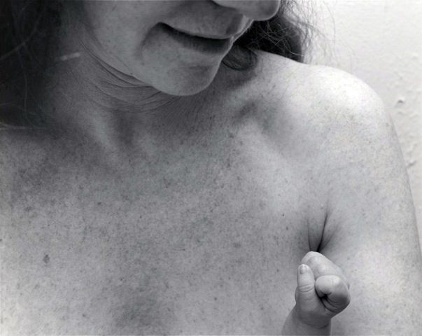 (図2)のように手の仕草に焦点を合わせ、身体の一部分をとらえた写真は、引いた視点から全身を捉えた写真よりも見る者の想像を喚起する力を持つこともあります。アメリカのニコラス・ニクソン(Nicholas Nixon, 1947-)は、ポートレート写真や身体の一部を8×10インチの大判カメラで撮影した作品で知られています。通常大判カメラは風景や建造物、静物の撮影に用いられることが多いですが、ニコラス・ニクソンは大判カメラを家族や身近な人の撮影にも用いて、肌の肌理や体毛などのディテールを精緻に描出しています。(図4)は、ニクソンの妻ベベが、生まれて間もない娘のクレメンタインを抱いている様子を捉えたものです。ベベは下の方に顔を傾けており、おそらく授乳をしているためか、肩と胸をあらわにしており、クレメンタインの小さな拳が下から突き出しています。小さな拳は、母親と娘の身体の大きさや皮膚の感触のちがいを印象づけるとともに、画面の中には捉えられていない母と娘の間の視線のやりとりを想像させる要素にもなっています。