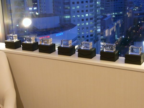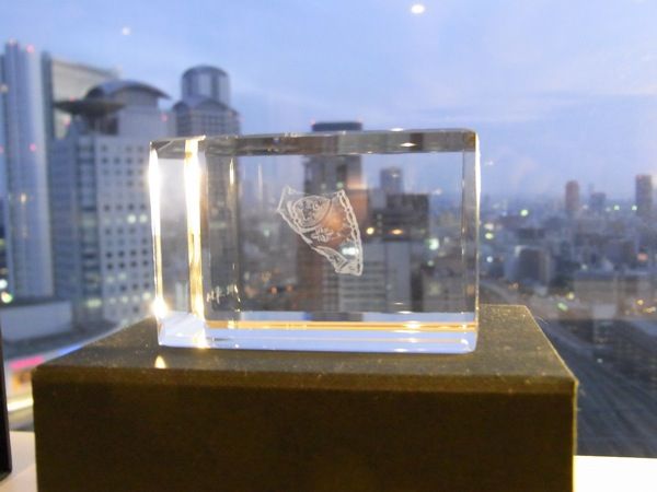 砕いた皿の欠片をパターンとして、ガラスの中にレーザーで掘り込んだ作品。