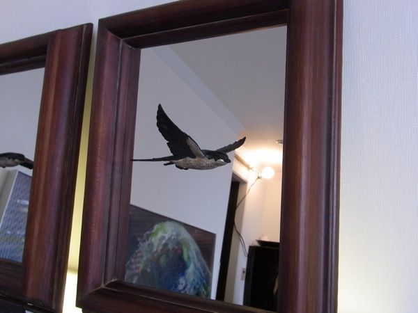 パッと見ると額の真ん中にツバメが浮いているように見えますが、実際に存在するのは手前の半身だけで、奥側は鏡に写った鏡像です。ツバメの周りを見れば鏡がはめ込まれているのは明らかですが、ツバメに関してはそういった認識が働かない辺り、人間の認識っていい加減ですねぇ。