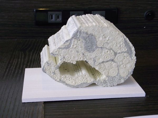タイトルにもあるホモネアンデルターレンシスとホモサピエンスについて書かれているナショナルジオグラフィック誌を帯状に切り、それを丸めたロールを組み合わせてイメージを作り上げている作品。ロールの大きさや形を使いこなして、陰影だけではなく、ちゃんと造形を成しているところがスゴイです。