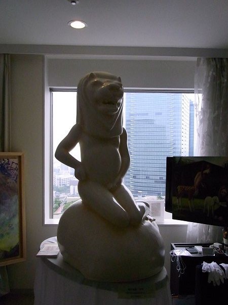 世界三大がっかり観光名物が奇跡のコラボ! これが新時代のがっかりだ! と、言わんばかりの作品。どこぞの伝承に登場しそうな風体ですが、ホテルの室内というロケーションが尚のことシュールさを醸しだしていました。ちなみにポンプを内臓しており、イメージビデオではちゃんと放水していました。