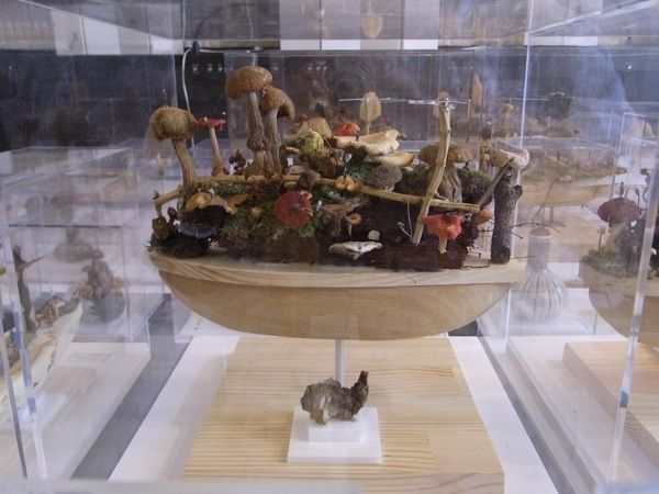 船の形をした土台に乾燥した様々な茸と粘菌、そして米粒サイズの人型で構成された、ジオラマのような作品。聞いた所によると、茸はもう乾燥しきっているのでどうにもならないが、粘菌は水を与えられればまた活動を開始するだろうとのこと。生命力(?)強いんですねぇ。