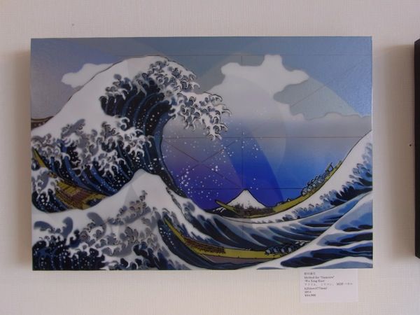 MDFの上にアクリルを塗り、その上にシリコンで透明なレイヤーを作ってその上にまたアクリルを塗ってシリコンでレイヤーを…という積層構造で立体的な構図を構成している作品です。そこかしこに図形が描かれており、基となった作品が確かな法則に基づいて描かれていることを示しています。