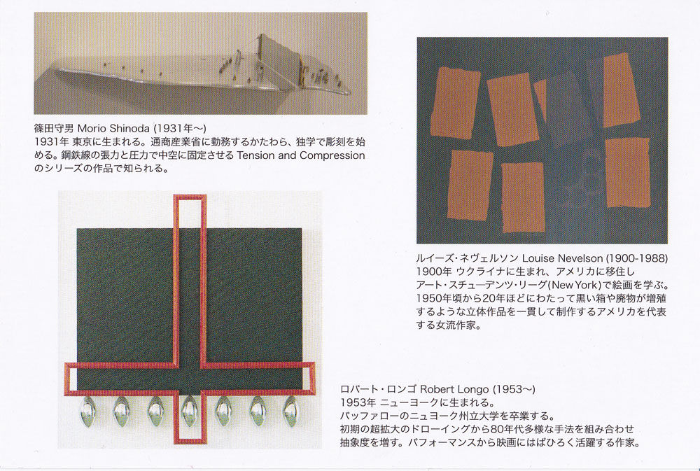 抽象彫刻を通して独自の世界を築いた三人の世界を、ロンゴと篠田の金属彫刻、ネヴェルソンが70年代に精力的に制作した版画シリーズによって展観します。