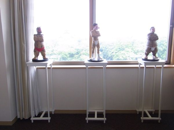05逆光が激しくて外が全く見えませんが、名古屋城とその周りに広がる森を背景に仁王立ちする葉栗剛の〈男気〉(ひょっとこ)(右)、〈男気〉(天狗)(中央)、《龍虎次郎》(左)の三点。背景にこれ以上なくマッチしていると、来場者の皆様にもご好評でした。中には「写真撮らせてもらっていいですか? 背景の名古屋城の」などと言うお茶目な方も。
