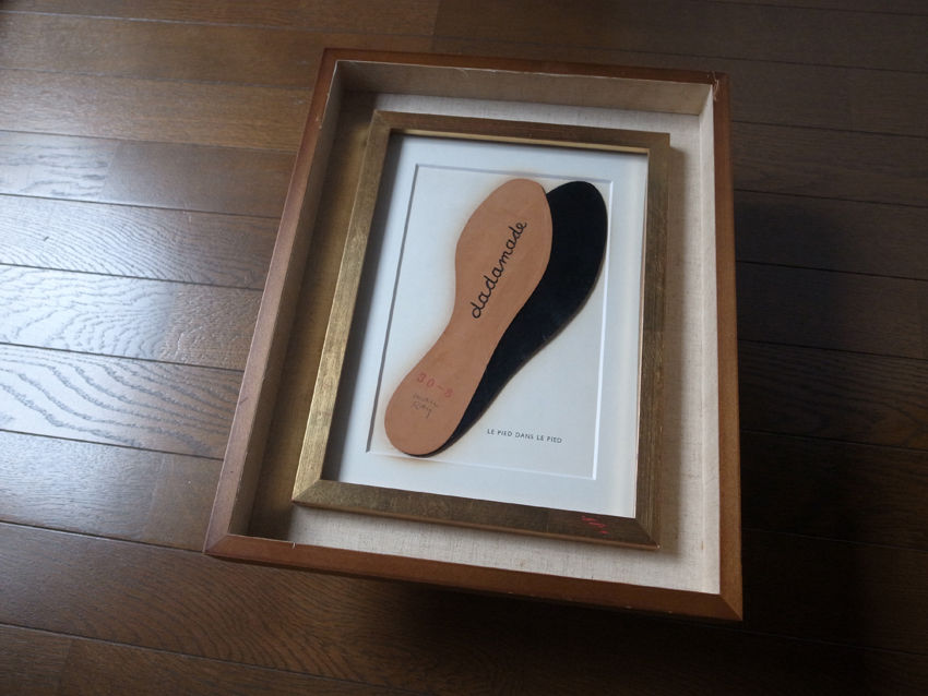 『ダダの冒険』原著(1957年刊)(左)と日本語新装版(1971年刊)この本に限定版があったのかと思うと休日まで待つことは出来ない。幸い仕事の関係で大阪へ出張する必要があったので終了後に神戸へ出掛け、トアロード画廊を訪ねた(2月6日)。阪神元町駅の山側、ビルの3階で天井の低い乱雑した空間だったと記憶する。見せてもらう前から興奮しているので、冷静な判断など出来ないけれど、筆記体で「dadamade」と書かれた靴の中敷きの迫力に、目が釘付けになった。既成の権威に異議を申し立てた「ダダ」の精神をストレートに現した作品だと理解出来たし、靴のサイズを連想させるような限定番号の表記(30-8)や、力強さを増幅させながら不安をも助長させる黒い革との重なり具合と相俟って、心に響く作品だと嬉しくなった。画廊の番頭を務める渡辺健次氏が仮綴本を取り出してユニュのサイン頁を見せてくれると、挿入されていた中敷きの跡がうっすらと認められる臨場感、本の状態もすこぶる良くて、持って帰りたい一品となった。