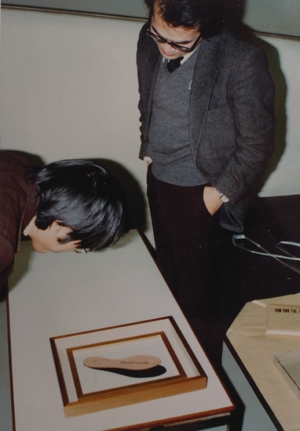 この本に限定版があったのかと思うと休日まで待つことは出来ない。幸い仕事の関係で大阪へ出張する必要があったので終了後に神戸へ出掛け、トアロード画廊を訪ねた(2月6日)。阪神元町駅の山側、ビルの3階で天井の低い乱雑した空間だったと記憶する。見せてもらう前から興奮しているので、冷静な判断など出来ないけれど、筆記体で「dadamade」と書かれた靴の中敷きの迫力に、目が釘付けになった。既成の権威に異議を申し立てた「ダダ」の精神をストレートに現した作品だと理解出来たし、靴のサイズを連想させるような限定番号の表記(30-8)や、力強さを増幅させながら不安をも助長させる黒い革との重なり具合と相俟って、心に響く作品だと嬉しくなった。画廊の番頭を務める渡辺健次氏が仮綴本を取り出してユニュのサイン頁を見せてくれると、挿入されていた中敷きの跡がうっすらと認められる臨場感、本の状態もすこぶる良くて、持って帰りたい一品となった。