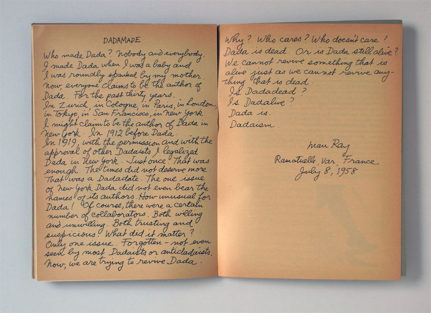 「dadamade」の筆記体に反応したのは、マン・レイによる同題のエッセイを読んでいた為でもあった。連載第2回で触れた季刊美術誌『gq』4号に掲載された「だれがダダをつくったか? だれもつくらないし、まただれもがつくった。」と始まる700字程のもので「ダダは死んだのか? 生きているのか? ダダは? ダダイズム。」と結ばれる。人知れず刊行された『ニューヨーク・ダダ』誌に思いを寄せた軽妙な調子で、作者の名前すら書かれていなかった雑誌を蘇らせようとする私たちへの警告、皮肉な立ち位置を示すものでありながら、「私たち」への呼びかけにはマン・レイ自身を含むニュアンスが濃厚で好ましかった。後に知ったのだが、このエッセイはデュッセルドルフの美術館で開催された大規模なダダ回顧展の折に、ジャン・アルプ、リブモン─デセーニュ、ラウル・ハルスマンらと共に求められた文章で、カタログに掲載されたのはそれぞれの原稿、マン・レイのものには南フランスの保養地ラマチュエルの地名と1958年7月8日の日付が入っている。