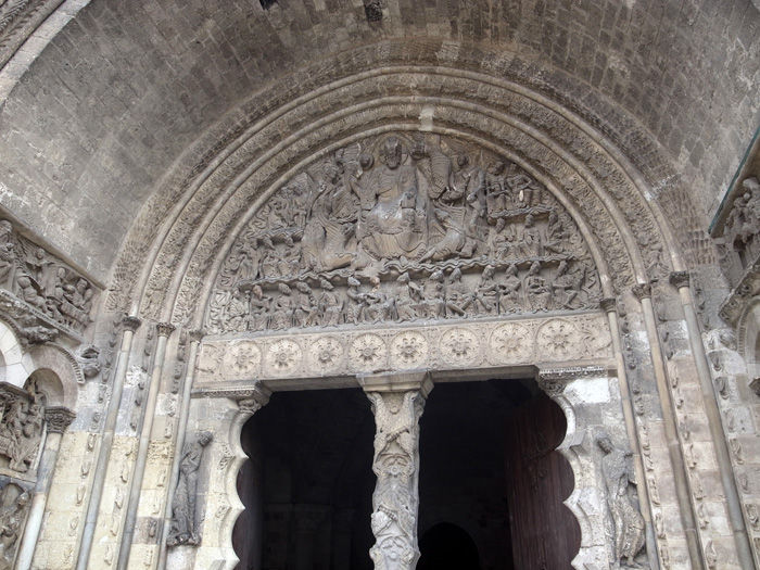 回廊をあとにして、正面入り口のファサード彫刻へ。黙示録にある「天上の礼拝」の場面が描かれている。中央に大きく描かれているのが栄光のキリスト、右手をあげて祝福を与えている。脇には4つの福音書記者を象徴する、人(マタイ)、獅子(マルコ)、牡牛(ルカ)、鷲(ヨハネ)が配され、金の冠をかぶった24人の長老たちが三層に彫り込まれている。その下の中央柱は正面に3対のライオン、側面に預言者エレミヤ、もう一方には使徒パウロの大きな彫刻がある。さらにその手前の扉の東西の壁面には、東に「キリストの降誕」、西に「罪人の運命」が三段に刻まれている。人々はこの扉をくぐるごとに、最後の審判を思い浮かべたのだろうか。