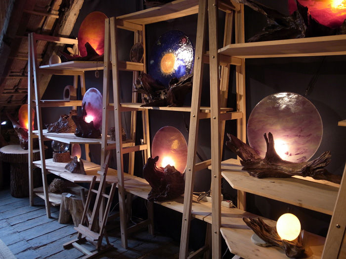 シエスタも終わり、リビングでくつろぐ。流木に薄いガラスをはめ込み、後ろに仕込んだ豆電球の光によって太陽や月を表現する作品には不思議なエネルギーがあり、感性を刺激する。そこにはまさに錬金術師の世界が広がっていた。