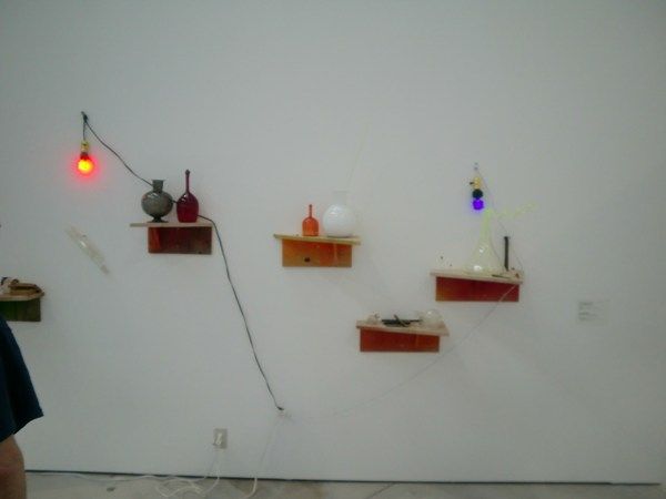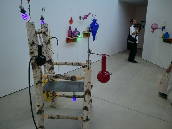 イライアス・ハンセンのフラスコなど実験器具のような手製のガラスの器に、木や金属、ビニールなど異素材の既製品を組み合わせたオブジェ