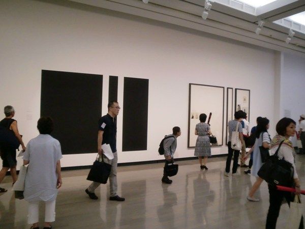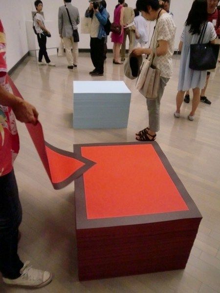 フェリックス・ゴンザレス=トレス(1996年没)の色紙を積み上げる作品。一葉ずつ人の手に渡り共有されることで初めて成立する作品で実にわかりやすく、たくさんの人たちが手に手に抱えていました。