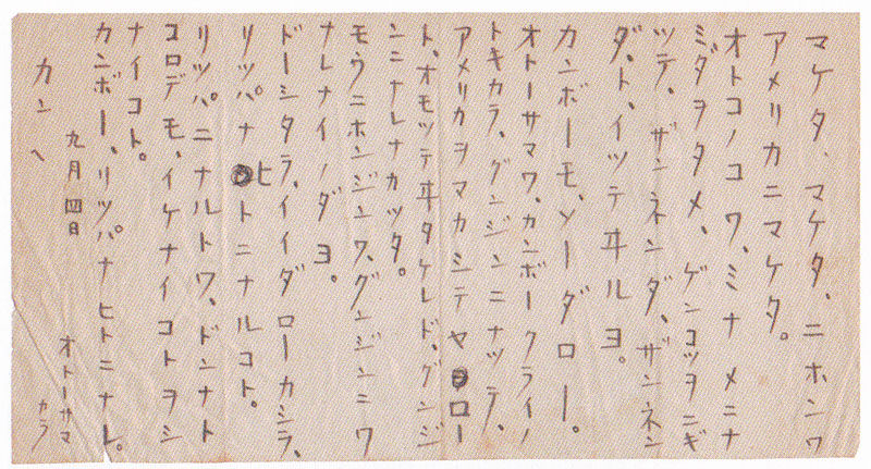オトーサマワ、カンボークライノトキカラ、グンジンニナツテ、アメリカヲマカシテヤロート、オモツテヰタケレド、グンジンニナレナカツタ。