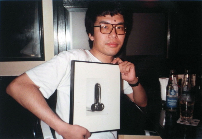 再び画廊を訪ねるとウインドウにはマン・レイのミクストメディア『桃風景』が置かれている。オフィスには『不滅のオブシェ』『贈り物』『鉋』『輸出必需品』といった愛すべきオブジェたち。女主人が梱包を解いて版画集の『時間の外にいる貴婦人たちのバラード』やリッジフィールド時代の裸婦デッサンなどを見せてくれるが、いずれも高価でわたしには手が出ない。でもどれか欲しいと算段していると、見覚えのあるアッサンブラージュを撮った写真が現れた。男性器を連想させるエロティックな一枚で、アルミ額に無造作に入れられている。小品故か値段も手頃だった。そうこうしているとマン・レイの未亡人ジュリエットが登場されて、パニックは最高潮。先程求めたジュリエットが写っているカタログのシートにサインを頂くと、山内さんがここにも書いてもらったらとTシャツの胸を示した。「Man Ray」のサインを拡大し赤色の染料を使って自分で書いた一枚(限定版ですよね)、新妻にも勧められ脱がされるしまつ。恥ずかしかったけど嬉しかった。彼女の方は黄色地に黒で「MAN RAY」のロゴ、袖の部分にジュリエットがペンを取った。そして、みんなで記念写真。わたしのマン・レイへの敬愛が伝わったのか、「明日、アトリエに遊びにおいで」と誘っていただいた時には、ついに、失神してしまった。……この二日間の様子については拙著『マン・レイになってしまった人』(銀紙書房、1983年刊)に詳しく書いたので参照していただけたら嬉しい。