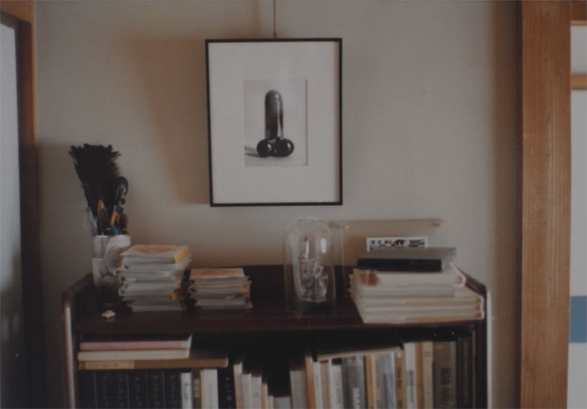 手荷物として持ち帰った写真を新居に飾った。アルトゥーロ・シュワルツの研究書『想像力の自由』(テムズ・アンド・ハドソン、1977年刊)で確認すると、1920年に作られたオブジェを基に1966年になって再制作された銀製のオブジェと関連がある写真と思われ、ニューヨーク時代のオブジェに共通する手許の日用品や、興味を持った品物を組み合わせた仕事の一つで、オリジナルは失われてしまったと推測された。アイデアを証明するために写真として残すマン・レイのやり方は、品物を残す必要を持たない詩人の心情に近い。そして、イメージを決定付ける重要な要素が作品のタイトルであり、この場合には『プリアポスの文鎮』と付けられた。1920年にマン・レイは30歳でフェレール・センターに通っていたから、ギリシャ神話に登場する生殖と豊饒を司る神についての知識は持っていたと思う。陰茎の隠喩として使われ、侮蔑語でもある「プリアポス」巨大な男根で象徴される男性の生殖力の神をマン・レイは、何処かで見付けてきた鉄玉と金属の筒を組み合わせて産みだした。写真を見たとき強く促されたのは、新婚旅行の故だろうか。再制作品は台座に置かれているが、求めた写真はフラットで、右からの光りで立体感を増し、陰茎は黒く、左右の陰嚢と鬼頭表面に撮影者の影が写っている。よく見ると大きな窓のようでニューヨークのアトリエかと思われる(とすれば、オリジナルを写した貴重な写真になる訳だが)。