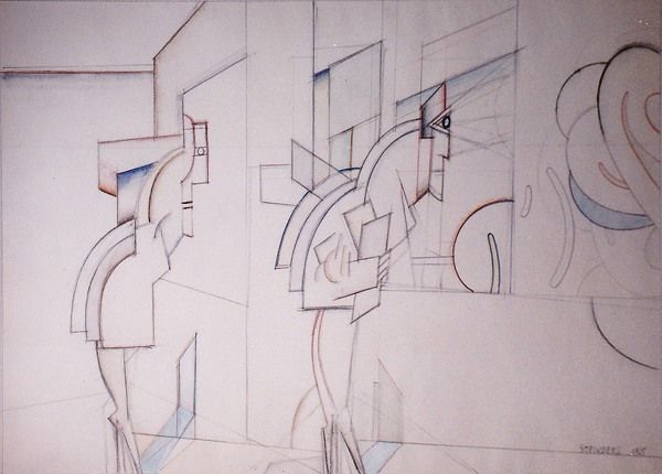 スタインバーグの60年代の作品。このあたりで、シッカリと自分のスタイルを確立。キュービズムとアール・ヌーボーのスタイルを混ぜ合せたような独特の画面からは、一種のユーモアさえも感じさせる。この2人のご婦人は何をしようとしているのだろうか……?