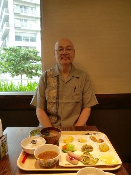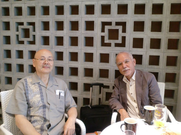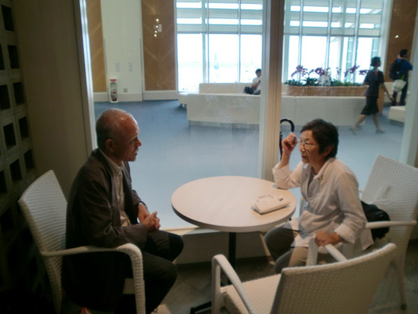 那覇国際空港のカフェで、韓国の光州ビエンナーレから帰国したばかりの画廊沖縄の上原誠勇さんと会う。