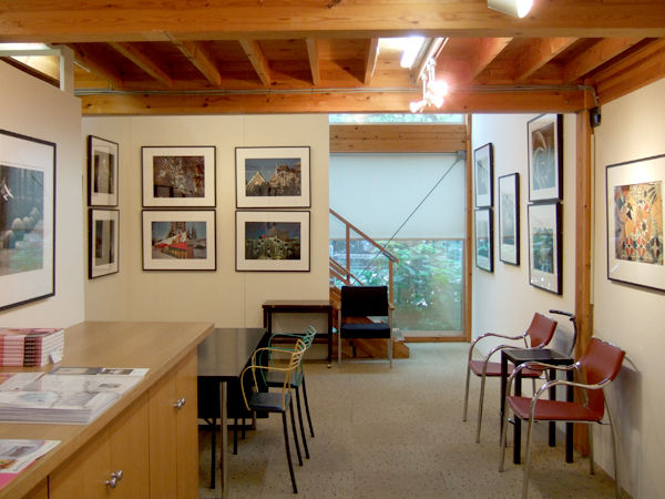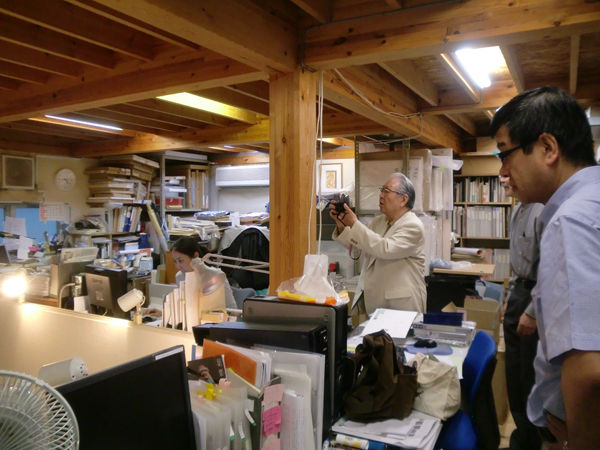 普段は非公開(すいませんご覧の通りの乱雑さ)の事務所スペースにまでのぼり、階上から展示風景を自ら撮影する細江先生、右は韓国への単身赴任からようやく帰国できたMさん。