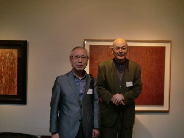 初期の代表作「アクアポリスの空」を出品された老舗画廊・椿近代画廊の椿原さん(左)と武男さん。