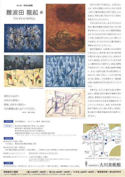 私たちの現在もまたさまざまに困難な時代といえるでしょう。今、大川美術館において難波田龍起の絵画世界とじっくり向き合うことの意味にも思いをはせる機会になればとおもいます。