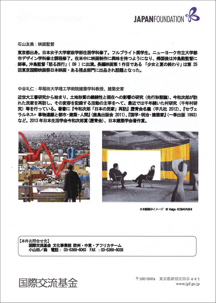 上映会(約1時間)に引き続き、展覧会プロジェクトチーム・ディレクターの中谷礼仁氏(早稲田大学教授)から現地の反響などを含めて展覧会を報告いただき、また石山監督とのトークも実施します。